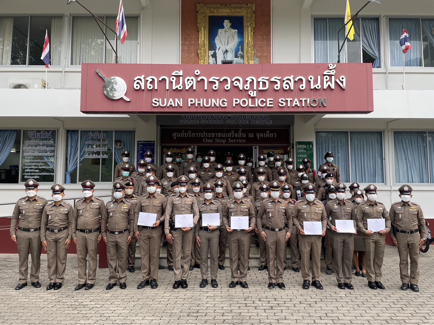 พ.ต.อ.อำนวย เด่นเวหา ผกก.สภ.สวนผึ้ง พร้อมด้วย พล.ต.ต.มนตรี ด้วงปรึกษา ผู้ทรงคุณวุฒิ ตร. และ คณะ กต.ตร. สภ.สวนผึ้ง พร้อมด้วยข้าราชการตำรวจ สภ.สวนผึ้ง พร้อมครอบครัว ร่วมกันทำบุญตักบาตร และมอบเกรียติบัตร แก่ข้าราชการตำรวจที่มีผลงานการปฏิบัติหน้าดีเด่นในแต่ละสายงาน