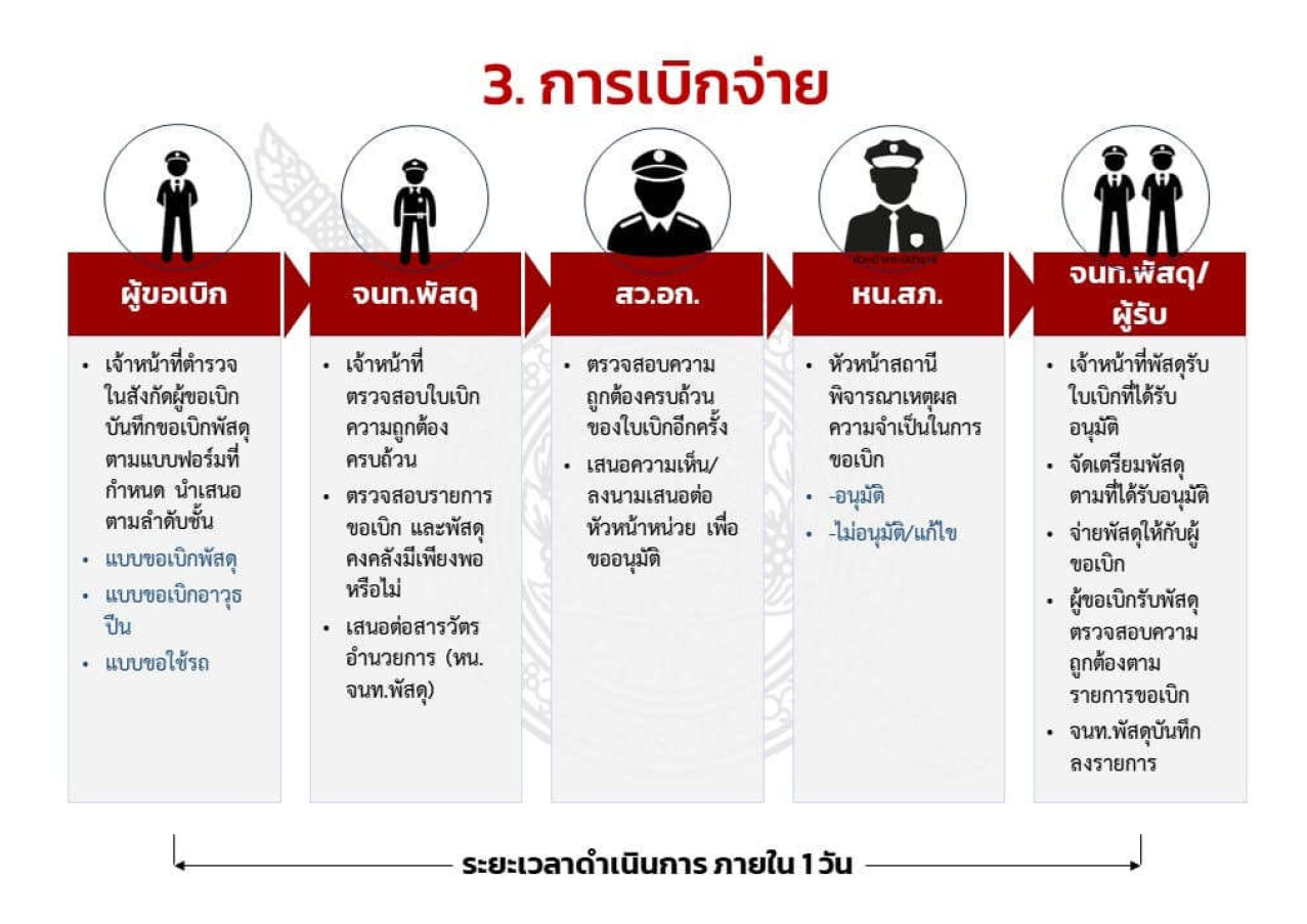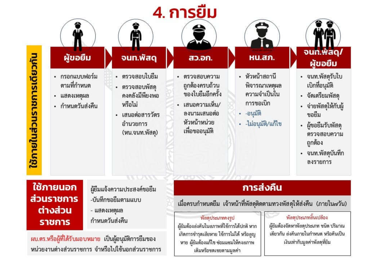 3. กำหนดแนวทางการยืมหรือเบิกจ่ายทรัพย์สินของราชการหรือของบริจาคไปใช้ปฏิบัติงานที่ชัดเจน